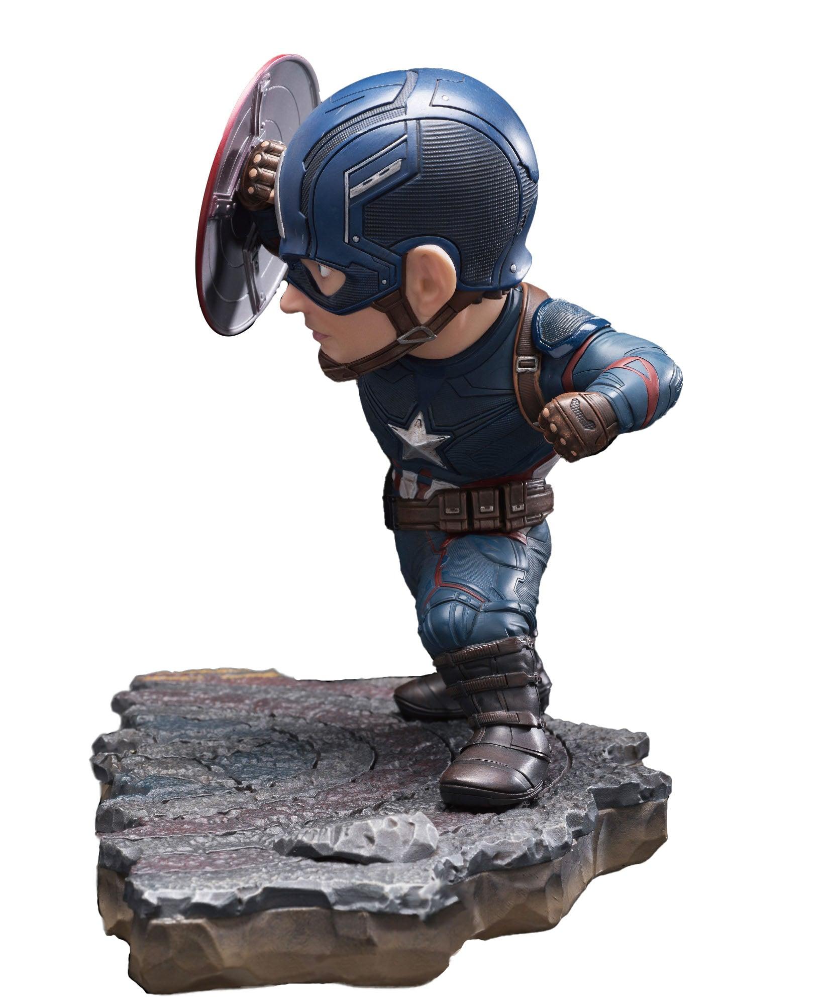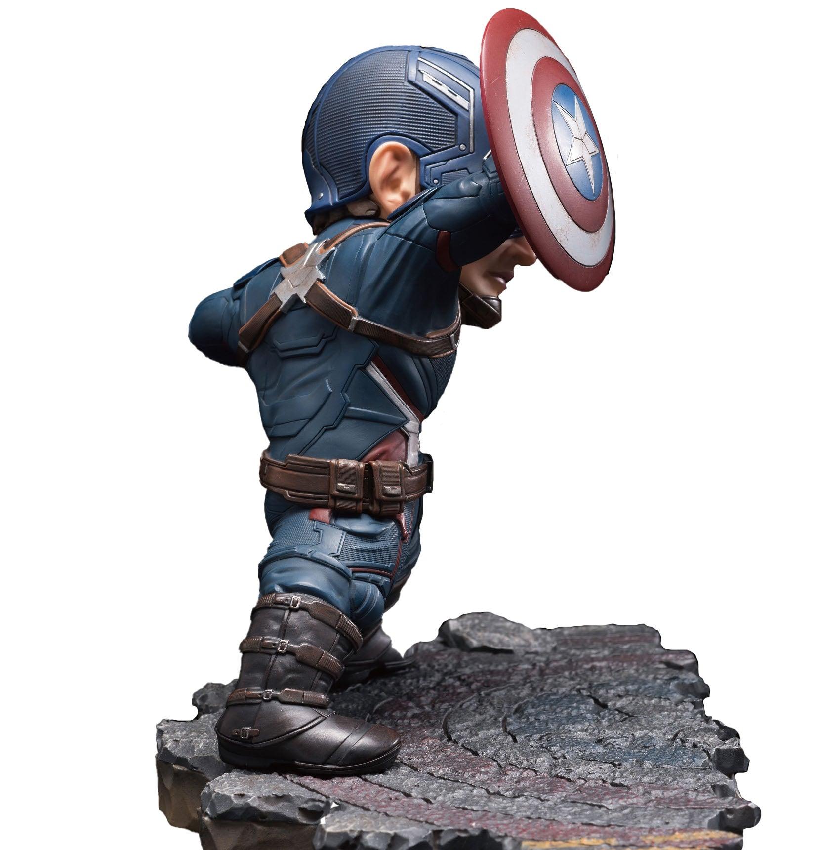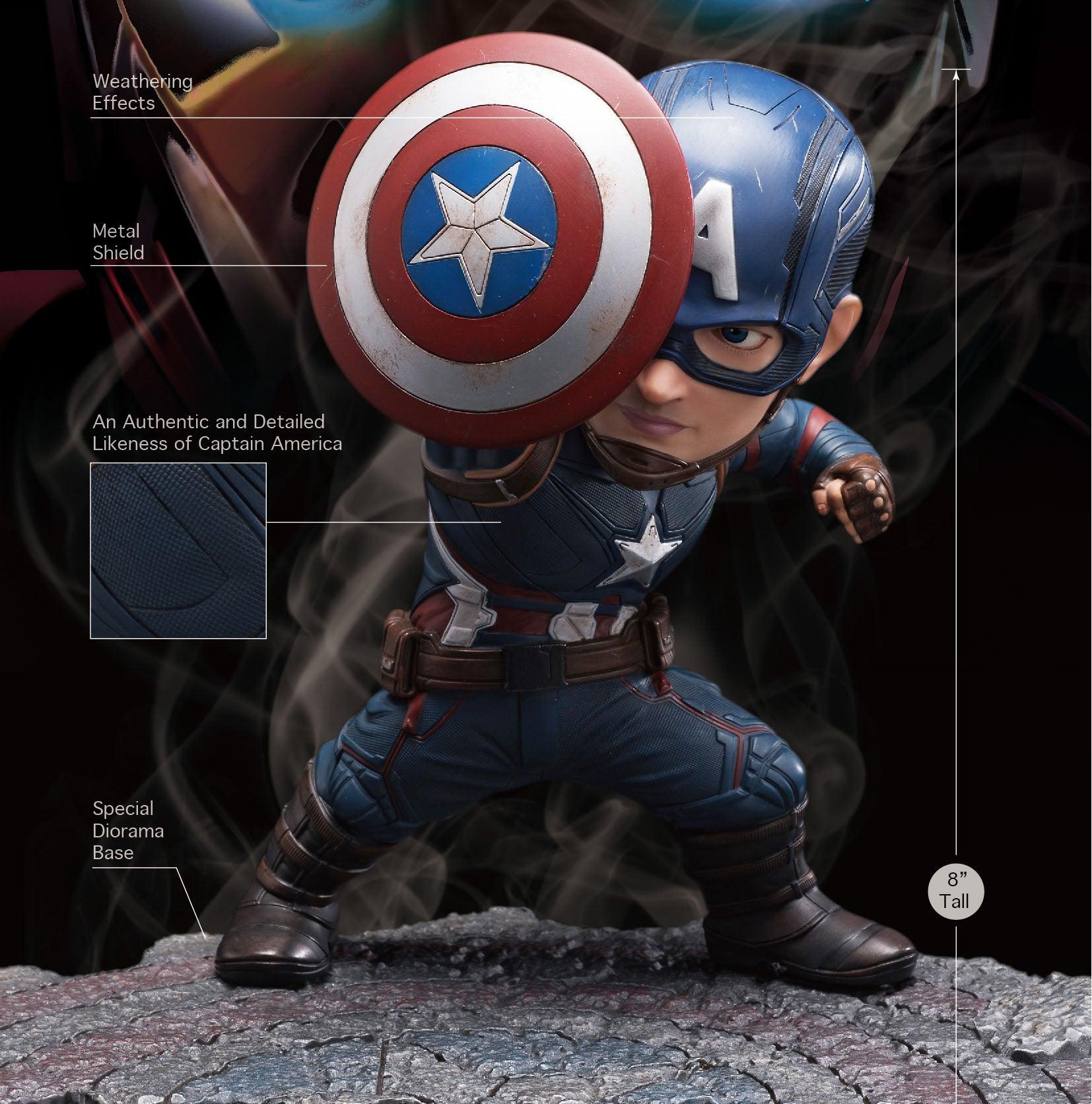 - Features Captain America's distinctive, slightly darker and more tactical suit from Civil War, complete with updated details on the star emblem, armored plating, and signature red and white stripes.