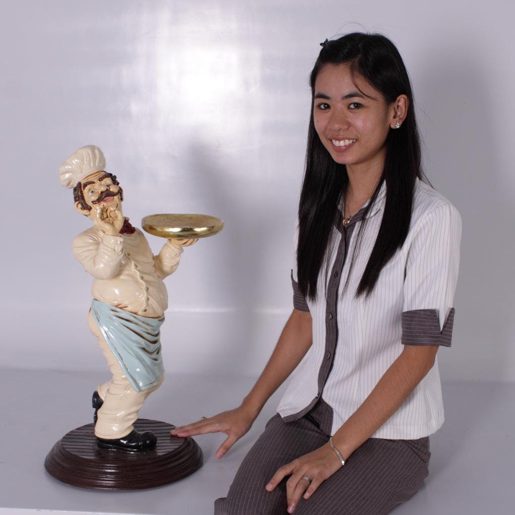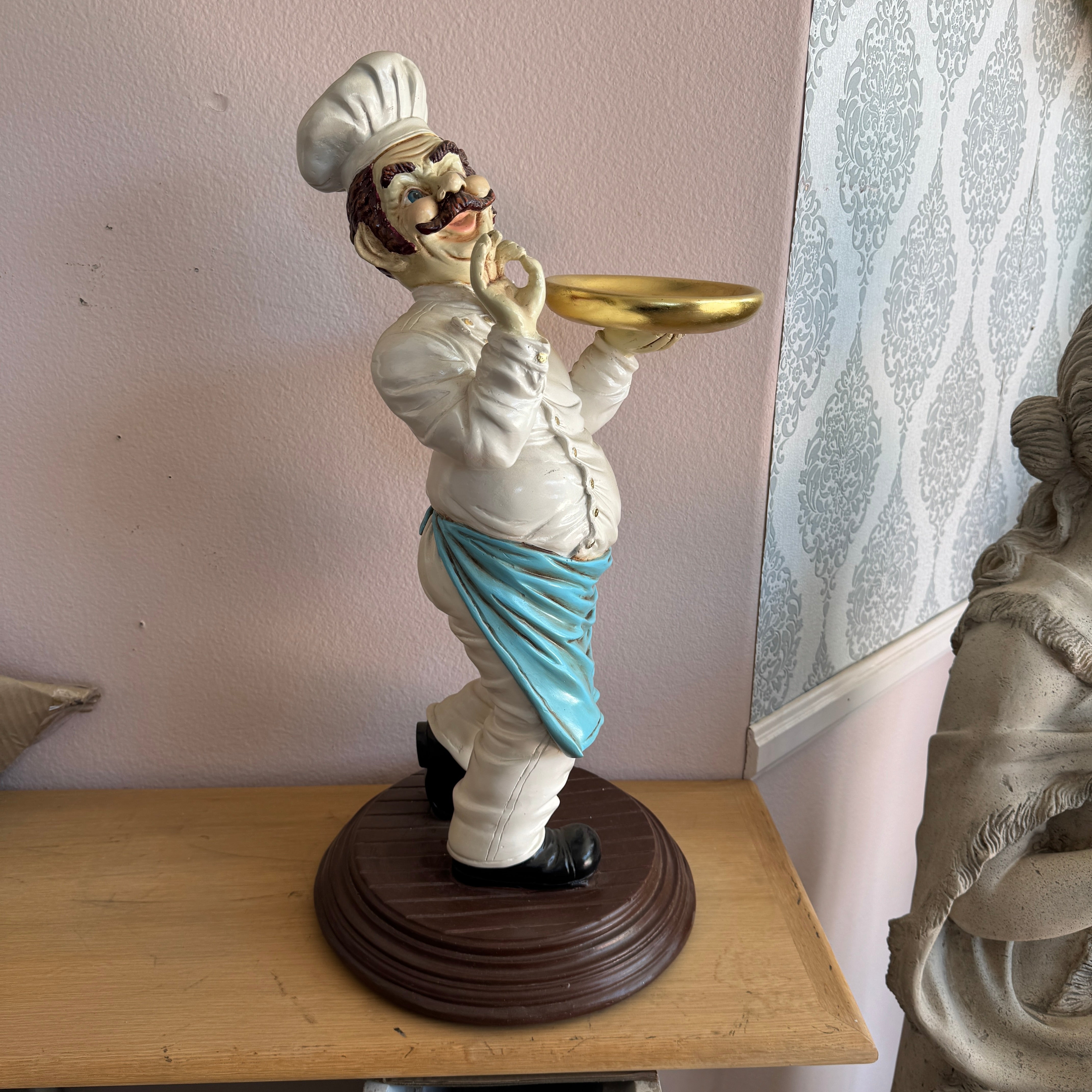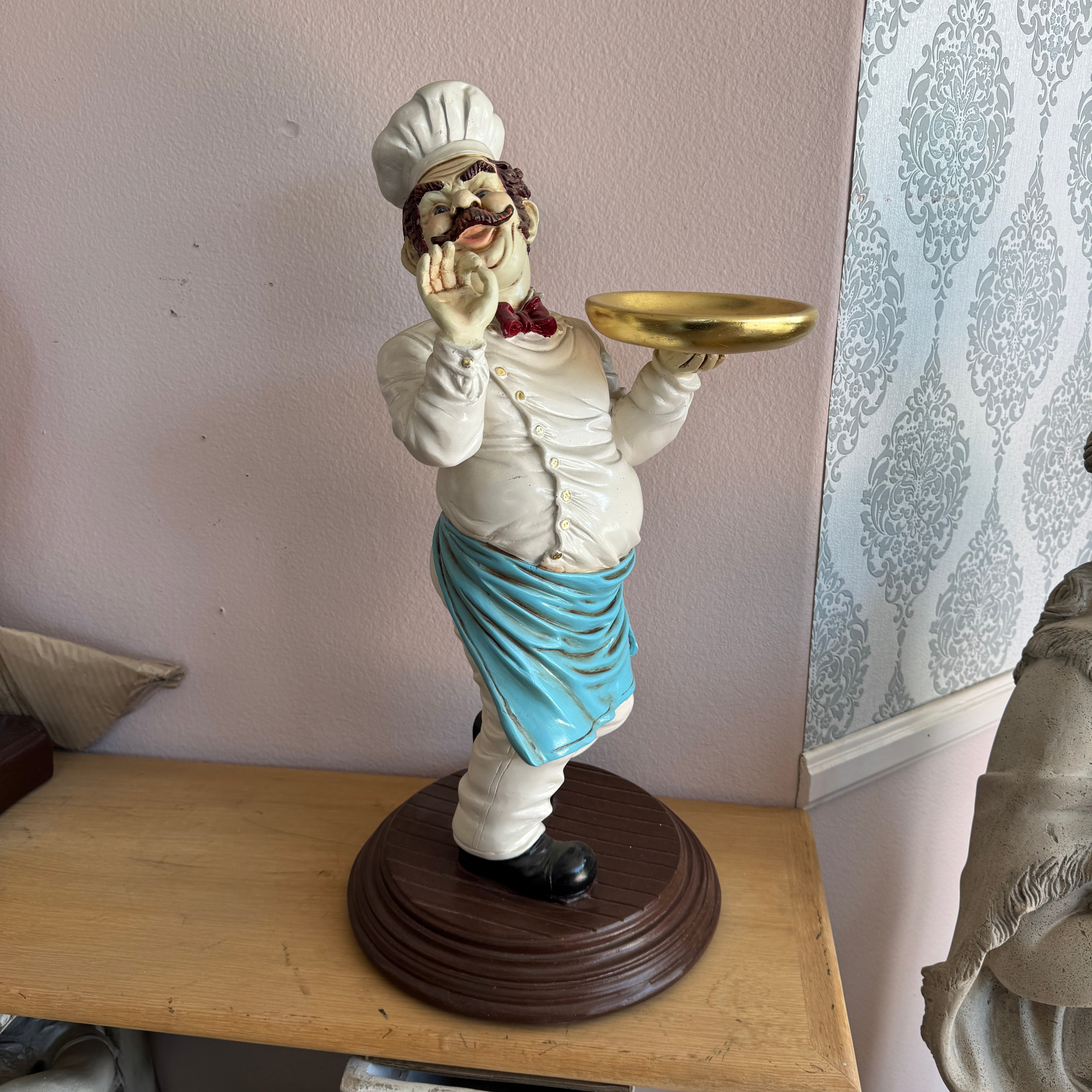 • Meticulously crafted, this small statue depicts a friendly chef in a classic pose, holding a small tray. Details include a crisp chef's hat, a neatly tied apron, and a cheerful expression. It's a miniature character that brings a sense of lightheartedness and a nod to the joys of good food and hospitality, making it perfect for those who love to cook, entertain, or simply appreciate unique decor.