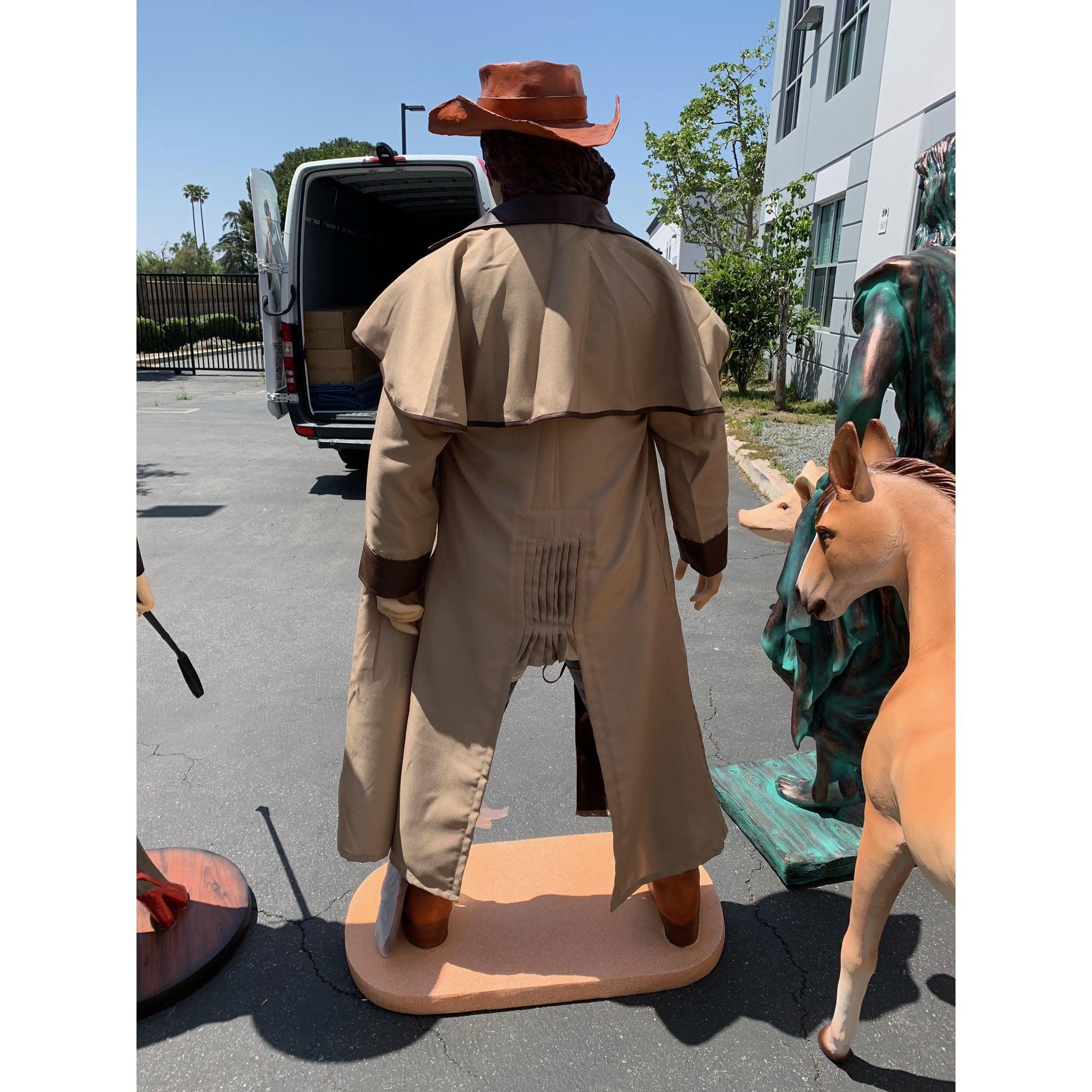 - Step into the wild west with this Cowboy Bounty Hunter Life Size Statue, proudly holding his shotgun and wearing an intimidating coat made of fabric material. Perfect for adding a playful touch to your space, he pairs perfectly with our other cowboys, horses, and barrels to create a full western scene. Bring a bit of cowboy charm to your home or event with this spirited figure.