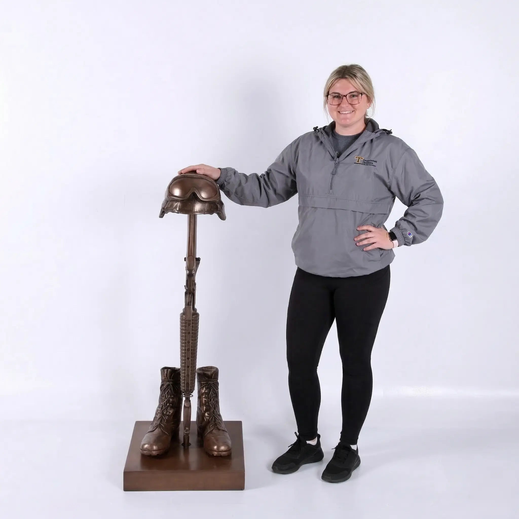 • Honor the selfless sacrifice of our fallen heroes with this poignant Fallen Soldier Memorial Statue. This powerful sculpture serves as a solemn tribute, depicting a soldier's helmet resting atop a rifle planted in the ground, accompanied by combat boots. This iconic image symbolizes a warrior's final battlefield rest, a powerful reminder of their bravery and ultimate sacrifice. Crafted with meticulous detail and a respectful tone. This statue is a meaningful addition to memorials, cemeteries, veterans' organizations, or private collections dedicated to remembrance. It stands as a timeless testament to their courage and a heartfelt expression of gratitude for their service.