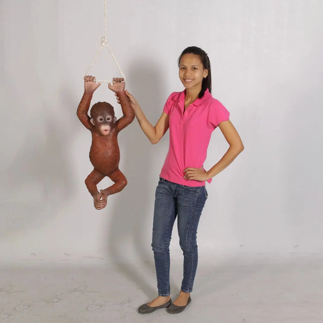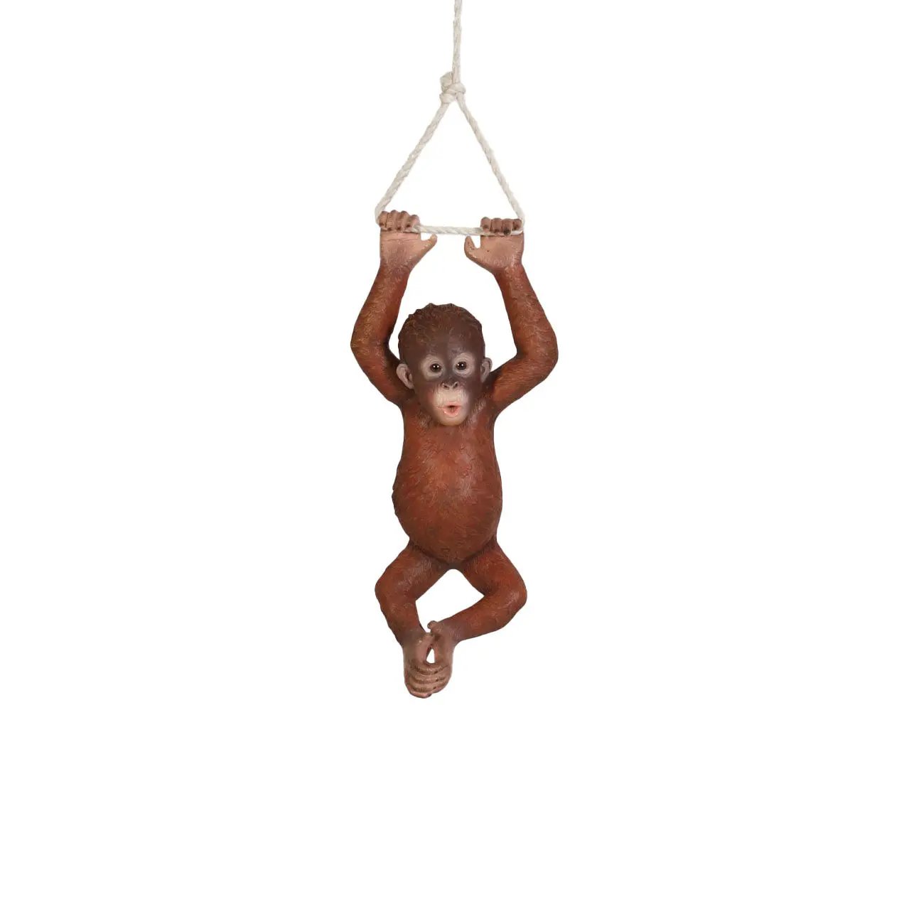 • Looking for a truly unforgettable and conversation-starting piece of decor? Our Life Size Baby Monkey Orangutan Hanging On Rope Statue is guaranteed to turn heads and elicit wonder. The combination of its realistic design, impressive life-size scale, and dynamic hanging pose on a natural-looking rope creates an unexpected and captivating focal point. Whether you're aiming for a touch of playful sophistication or a bold statement of your unique style, this hanging monkey is sure to deliver.