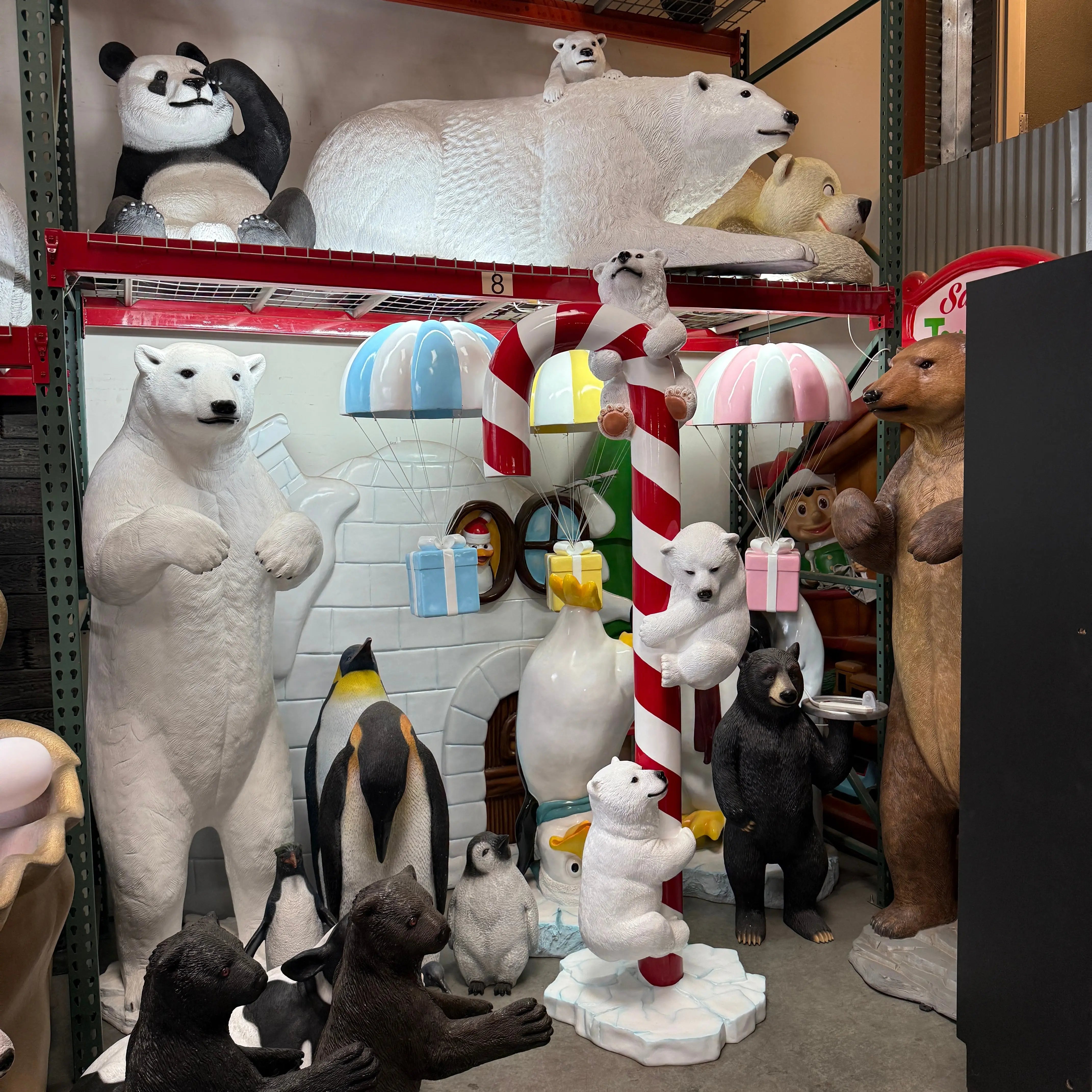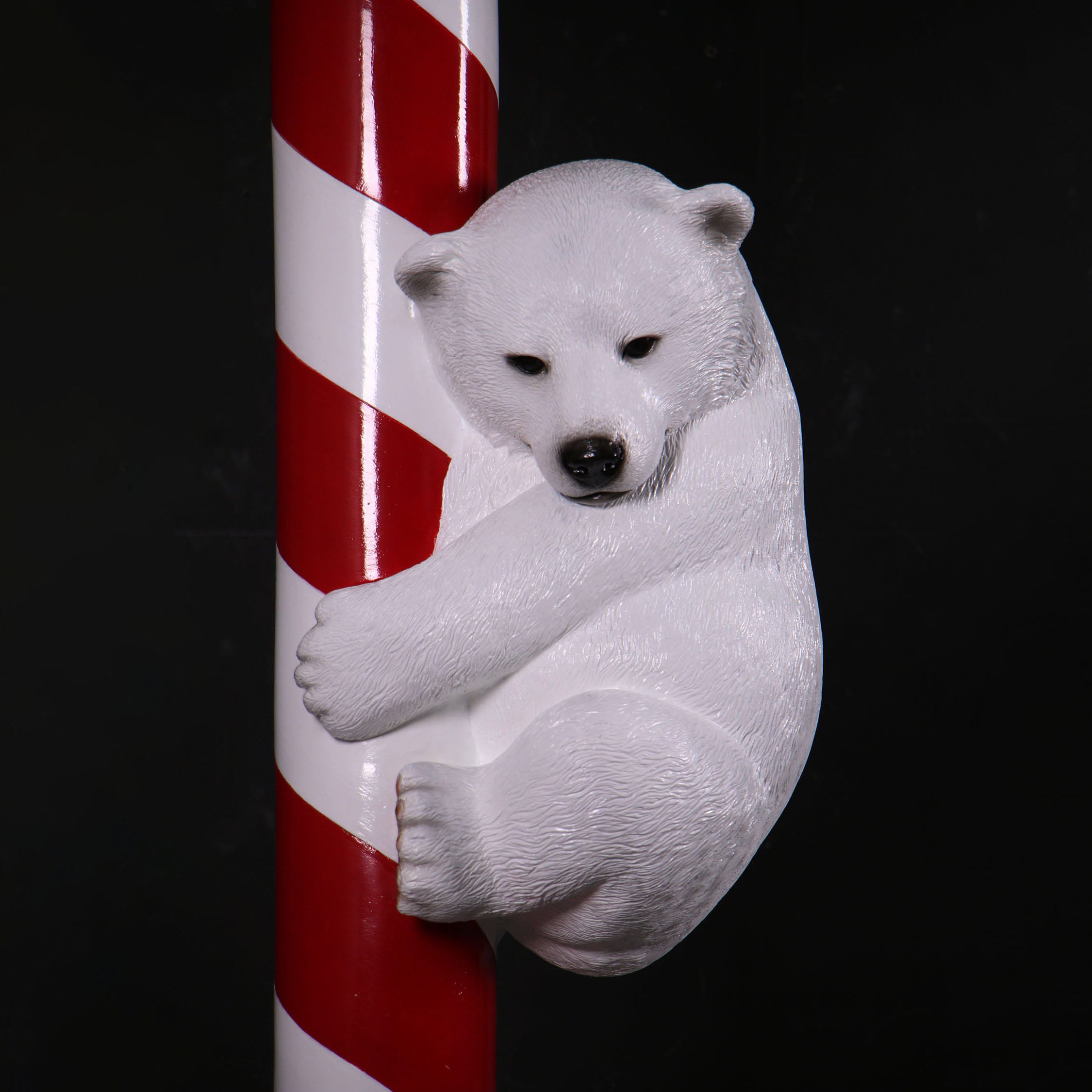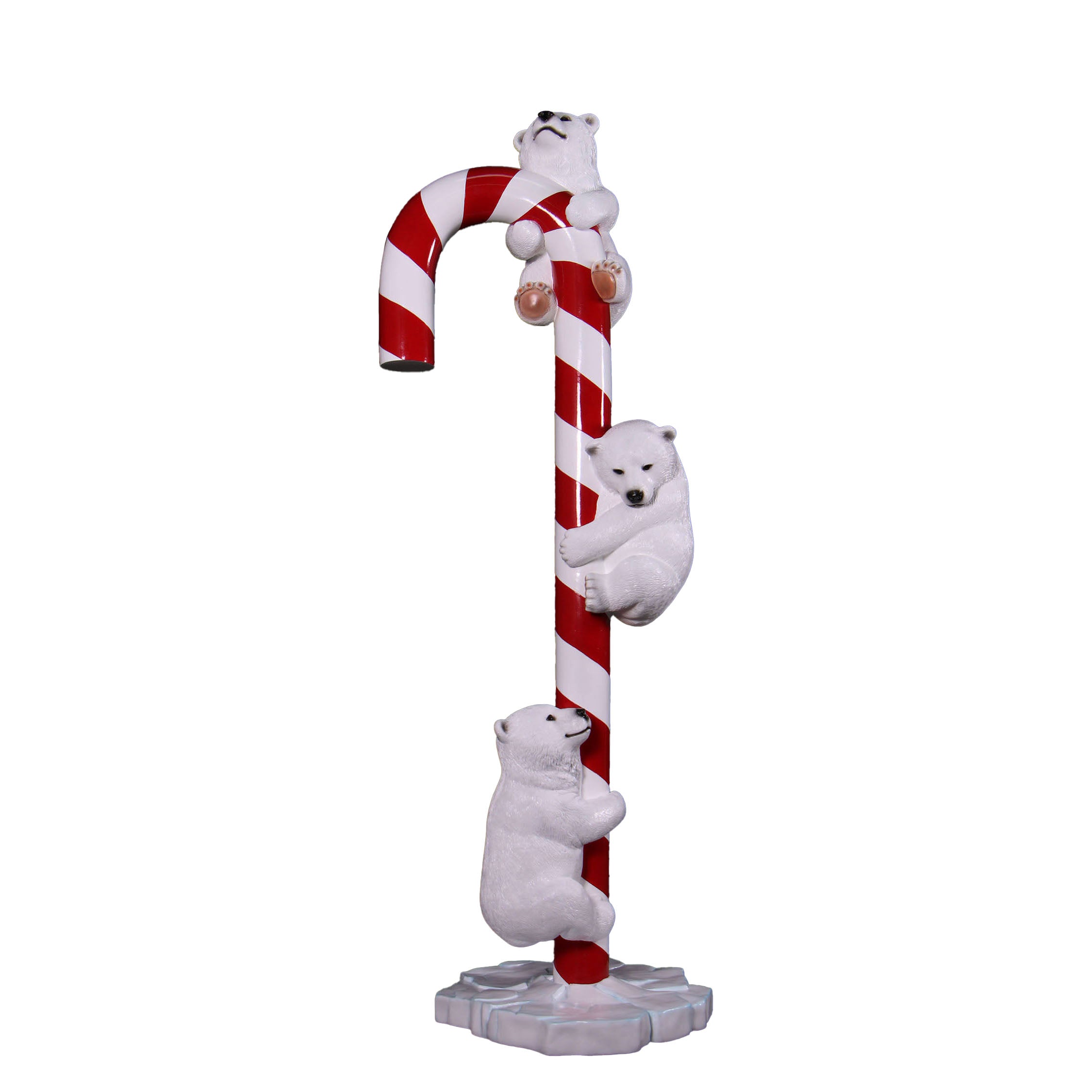 - Step into a winter wonderland with this charming statue featuring three playful polar bear cubs perched on an oversized candy cane. Perfect for adding a touch of festive cheer, this delightful decoration brings the magic of the Arctic right into your holiday décor. Let these adorable cubs brighten your season with their whimsical charm.