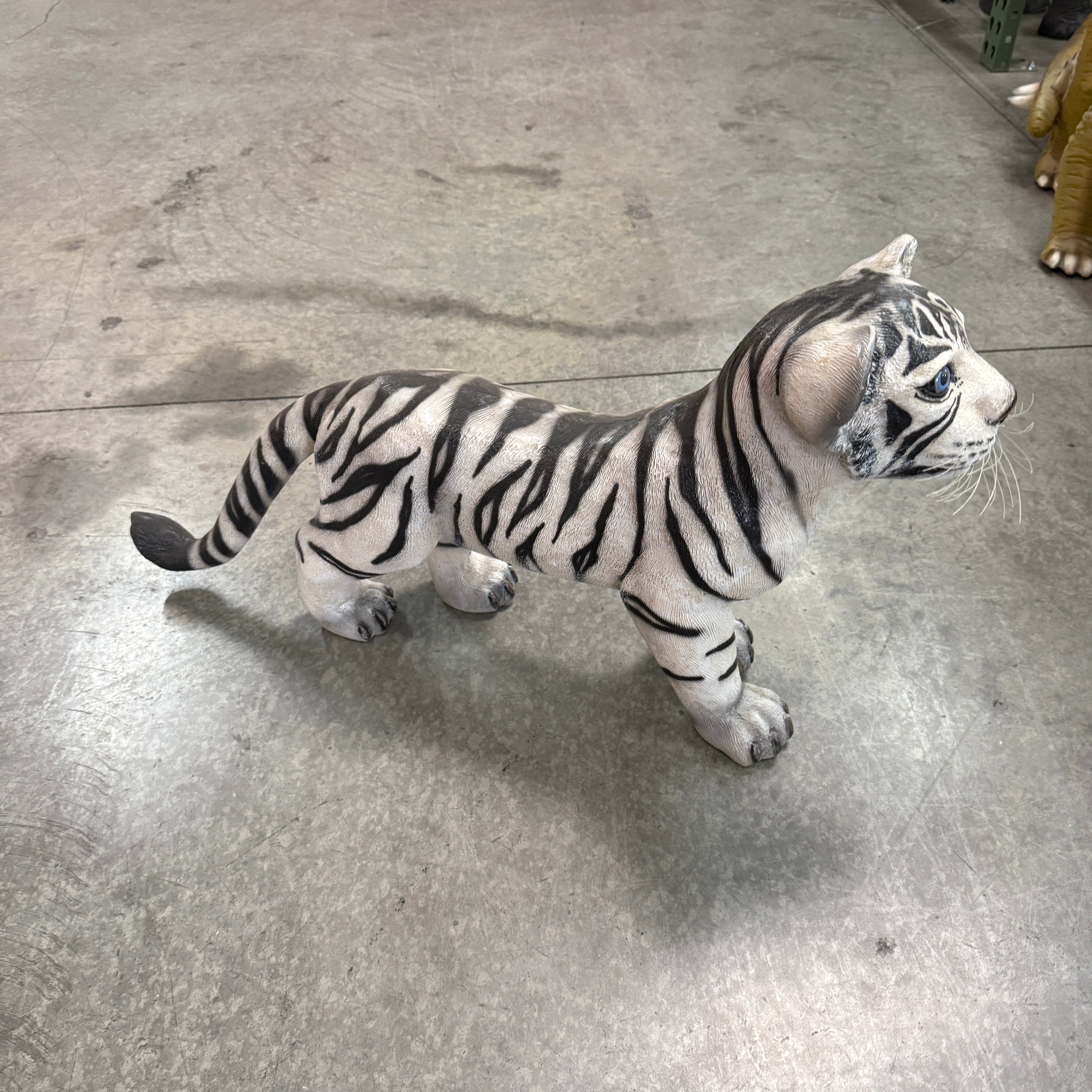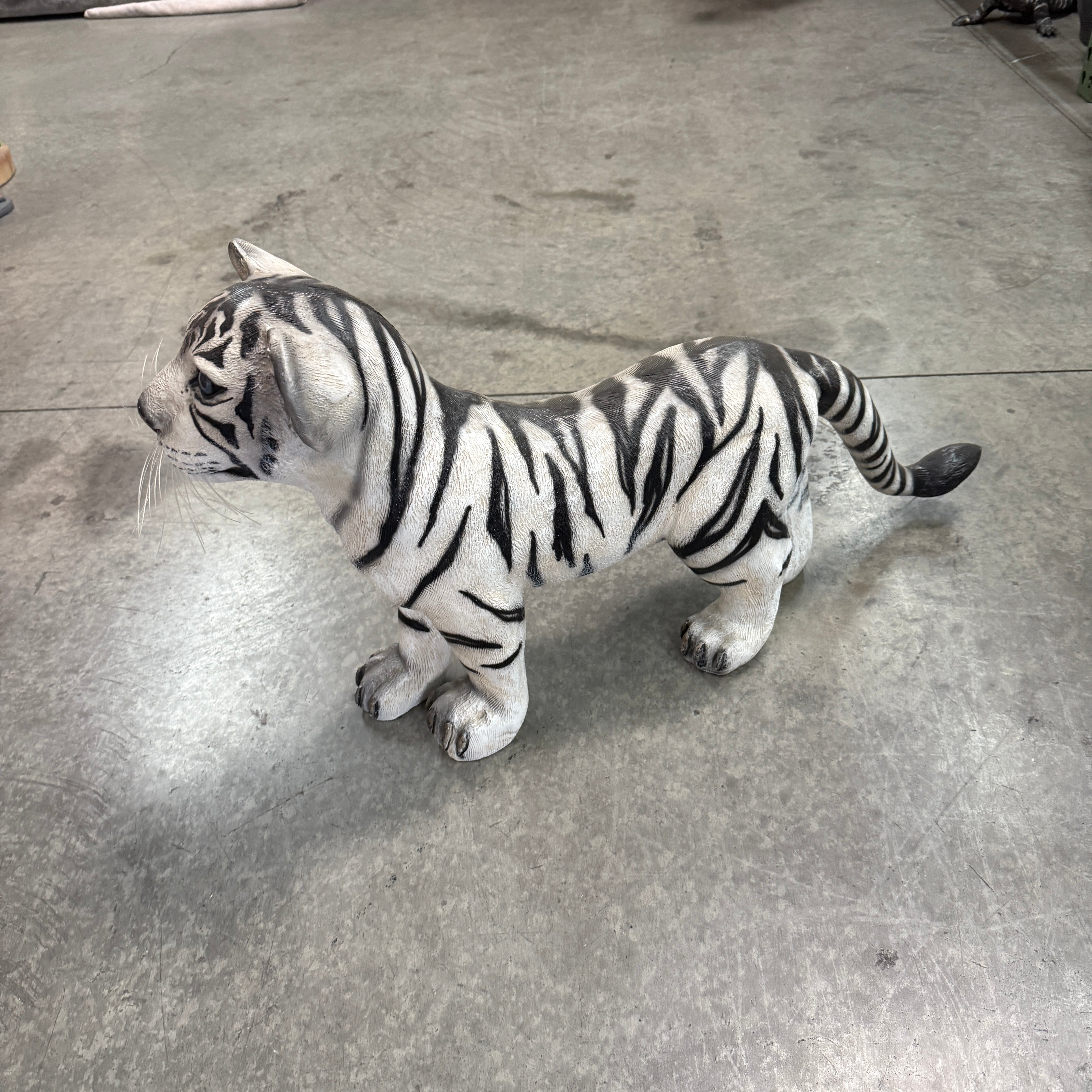 • Prepare to be enchanted by the captivating cuteness of this standing Siberian tiger cub statue. This charming life-size sculpture perfectly captures the endearing nature of a young Siberian tiger. This makes it a truly heartwarming and unique decorative piece. The intricate detailing of its soft, white and black striped fur and its playful stance contribute to its undeniable appeal. Whether placed indoors to add a touch of wild elegance or displayed in a sheltered outdoor area to delight visitors, this statue is guaranteed to bring a smile to everyone's face.