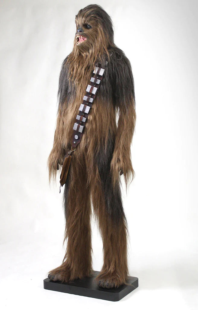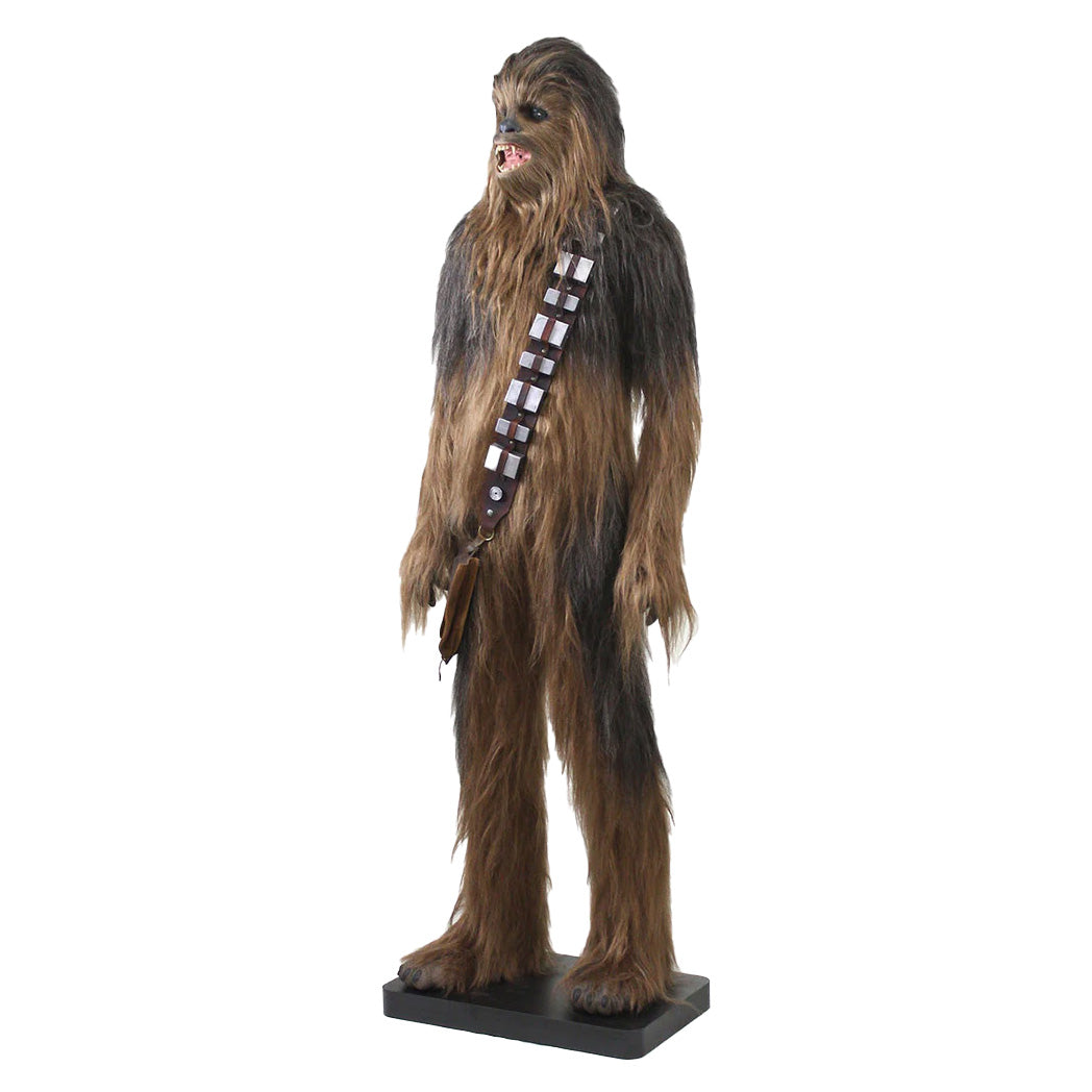 - This 7′ 6″ tall (7′ 9″ on the included museum base) Chewbacca statue features detailed silicone hands and a realistic, highly detailed Wookiee™ bowcaster. This full size figure of Chewie is a towering presence, made to accurately recreate the character’s incredible height. A team of FX artists developed the life-sized Star Wars figure with access to an original production-made face and teeth castings, along with hands-on examination of the original costume, mask and hair used in the original trilogy films.