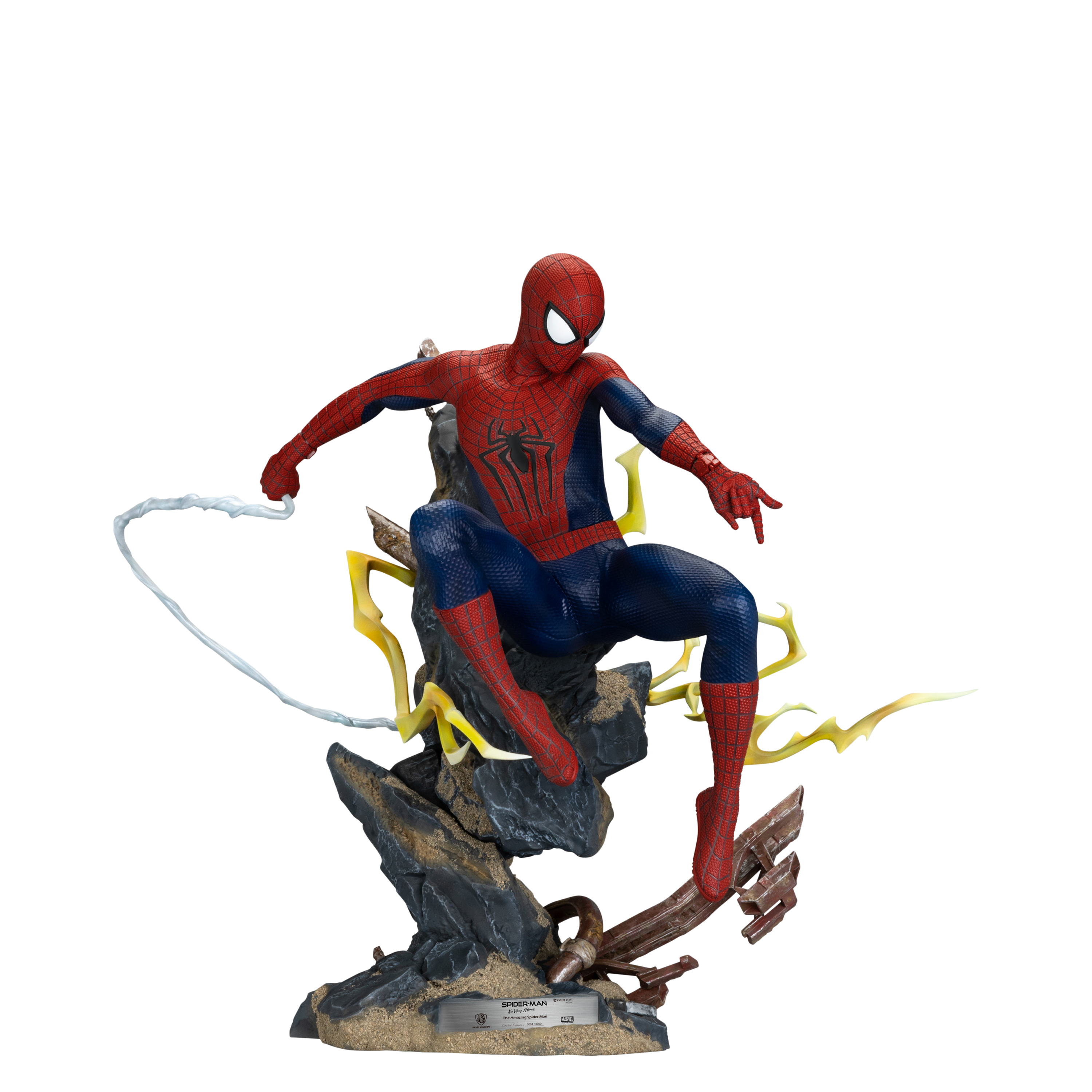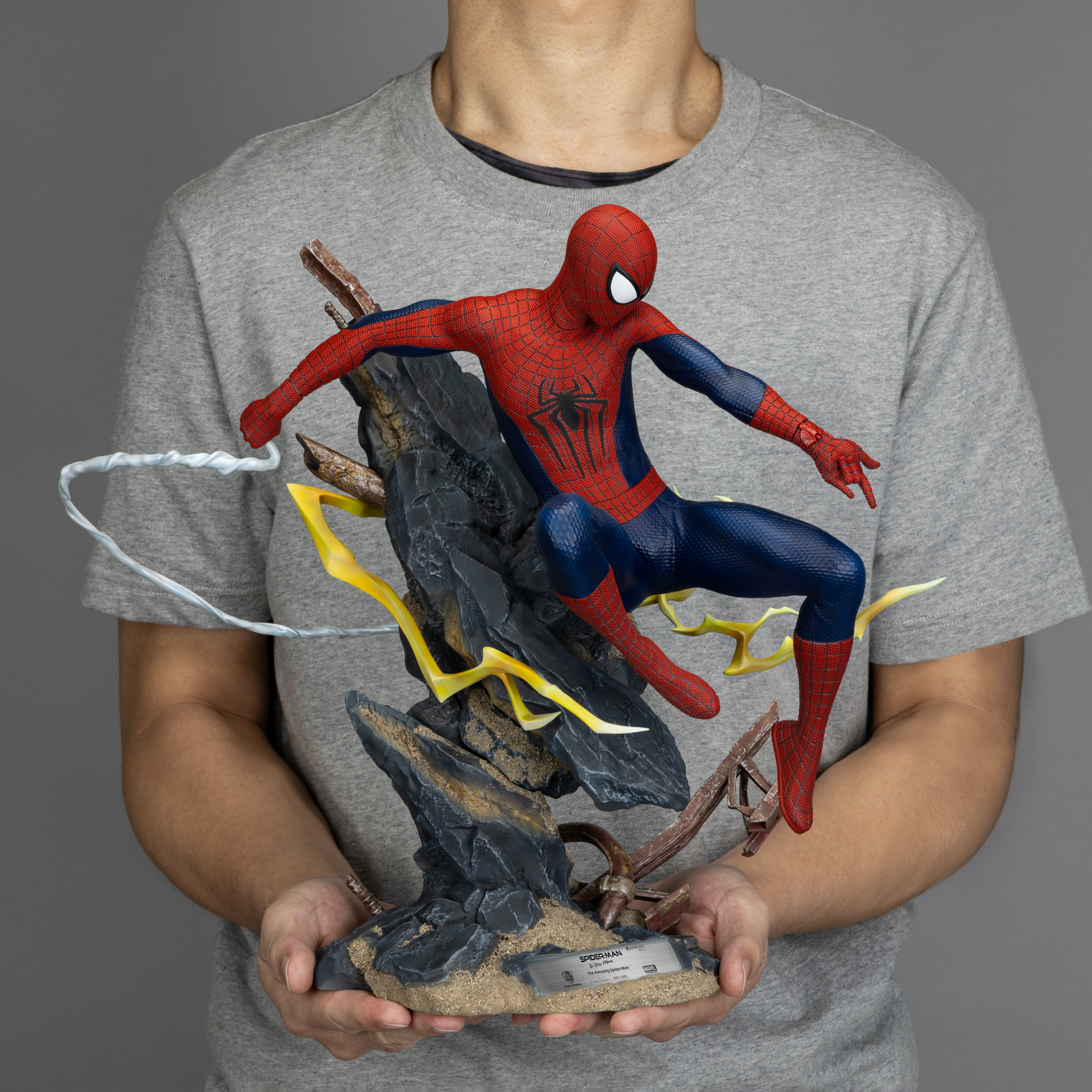 - As portrayed by Andrew Garfield, this Spider-Man is shown leaping into action, dodging Electro's lightning while firing webs. The deep blue and bright red costume, the large chest emblem, and realistic fabric textures are meticulously reproduced, highlighting a modern and stylish look.