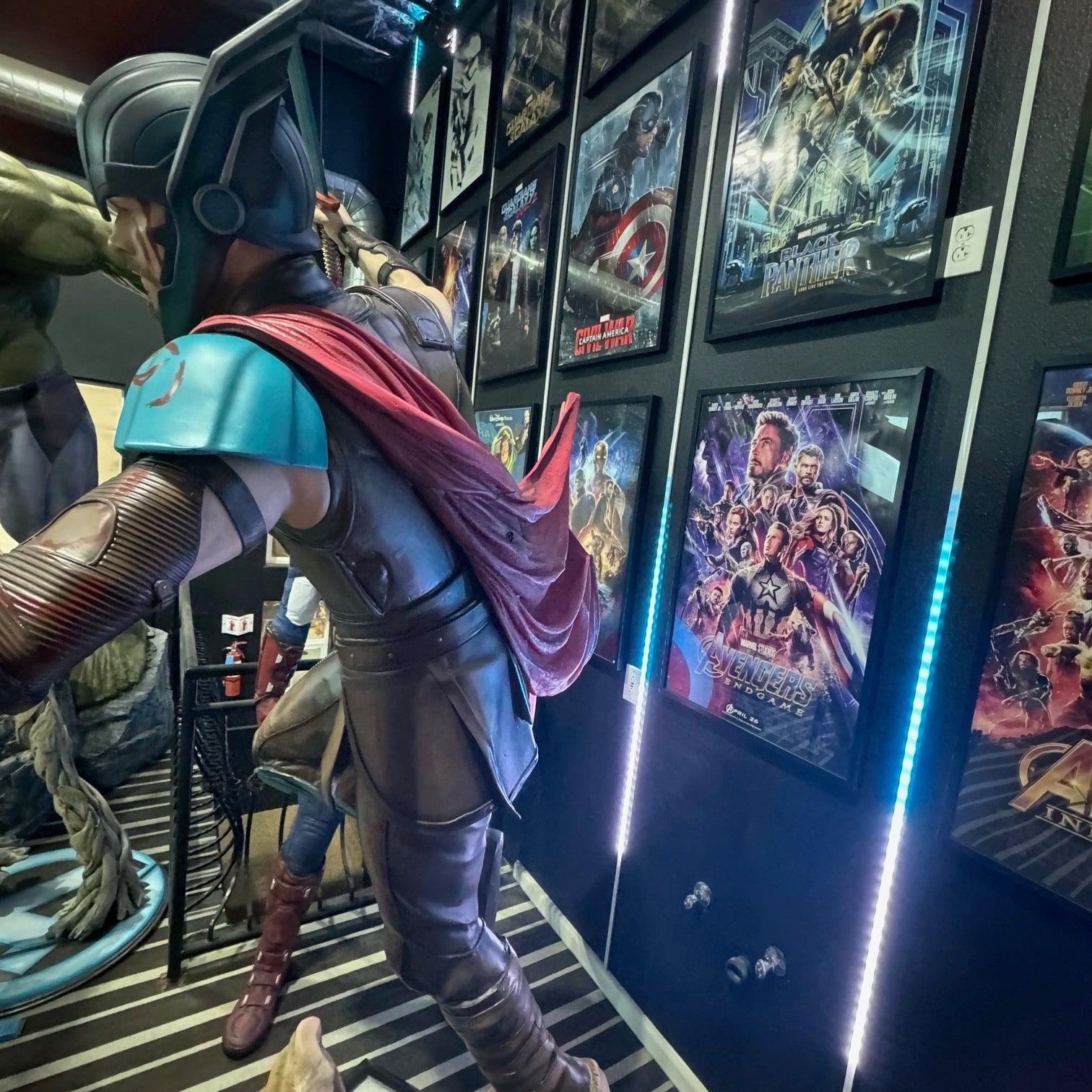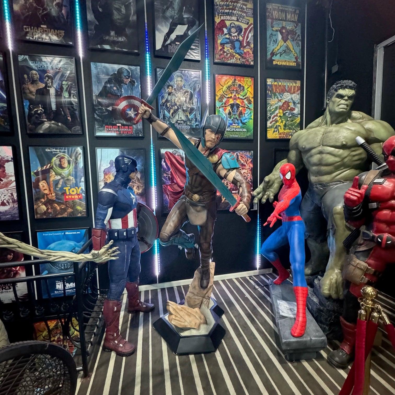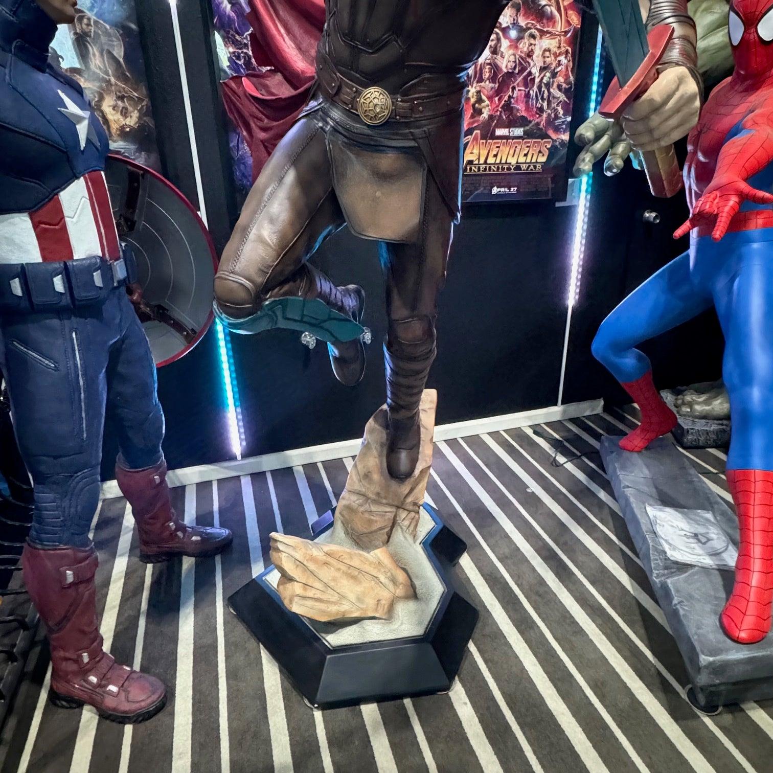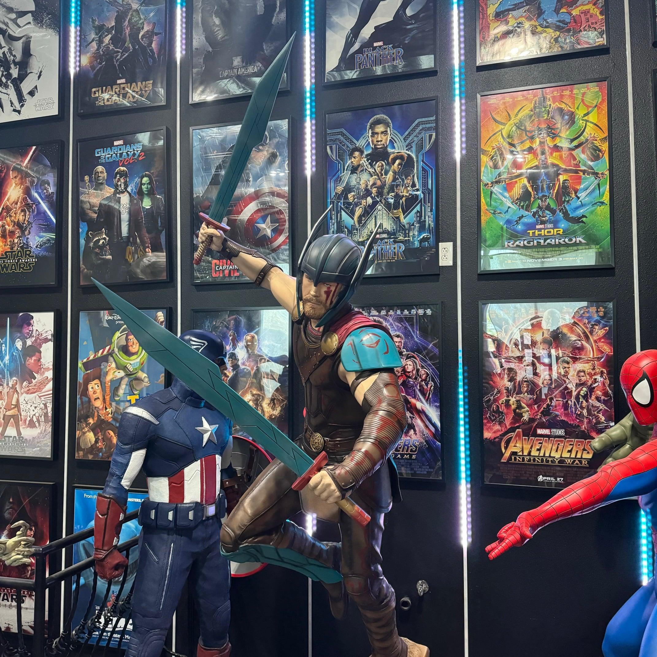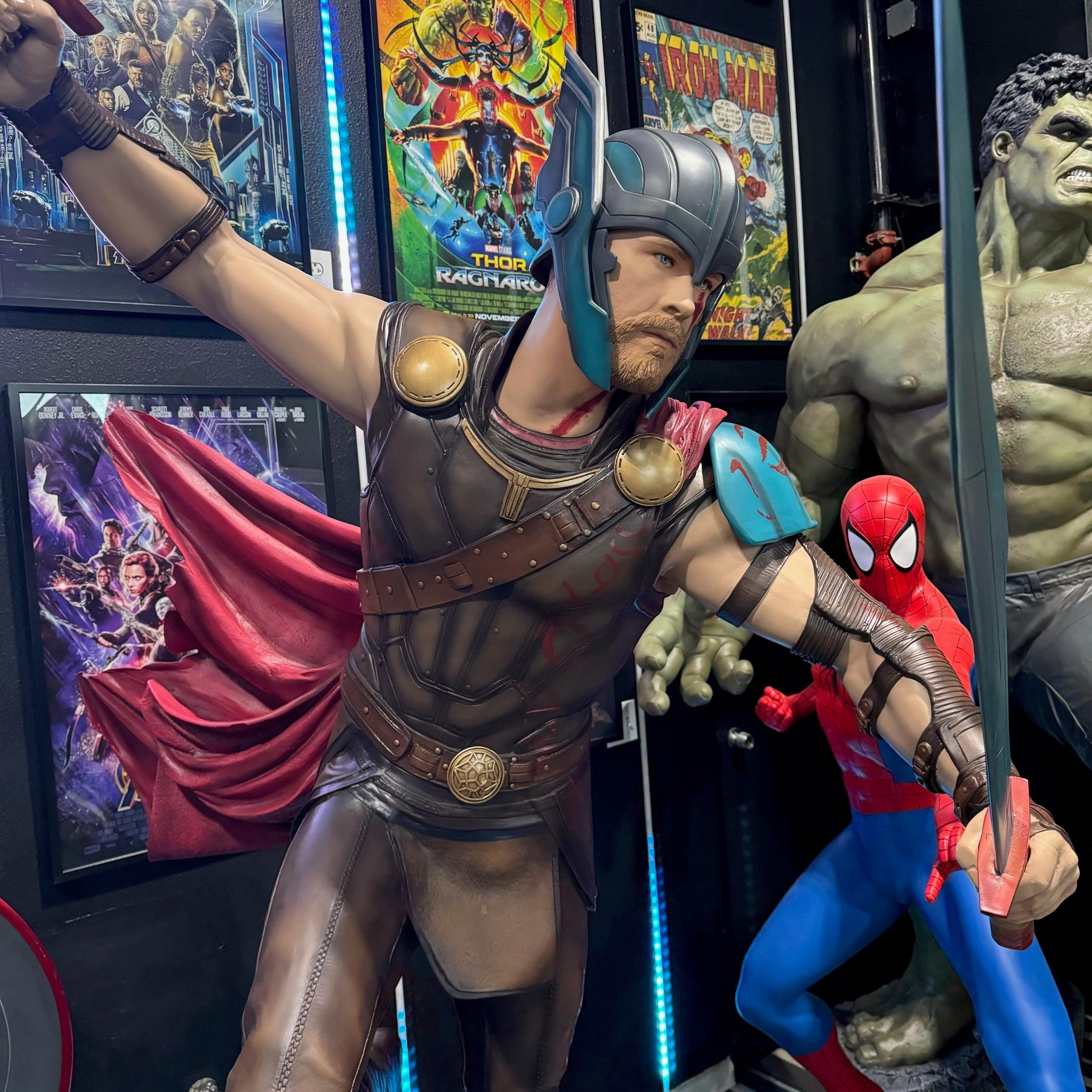 • Memorializing the vastly popular arena gladiatorial scene (in which Thor battles his friend, the HULK), this new action-posed THOR statue, made from fiberglass, comes complete with his gladiator outfit, including his new helmet and 2 swords.