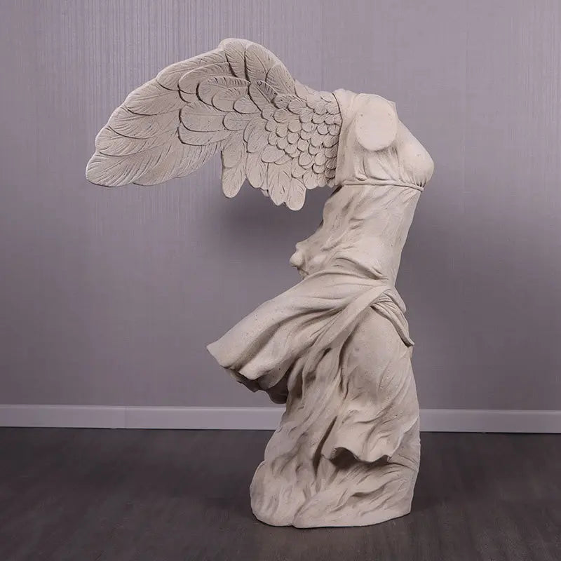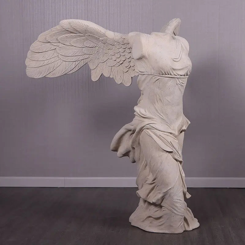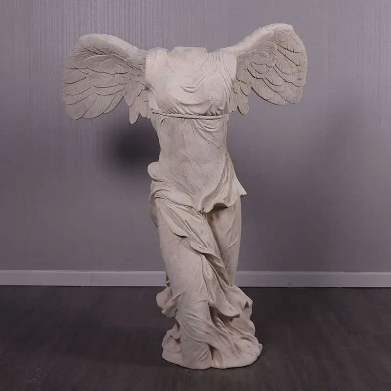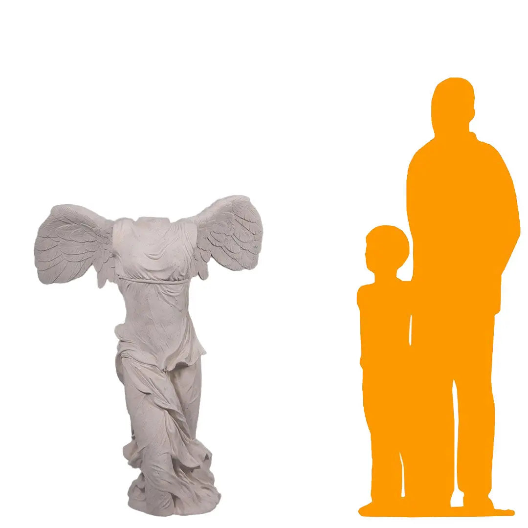 - Bring a Greek touch of heavenly charm to your holiday decor with this life size angel statue, beautifully crafted with a stone finish. Almost soaring, this winged angel of Samothrace adds a playful yet reverent spirit to your Christmas display, making it a standout piece for your festive celebrations or religious gatherings. Perfect for creating a warm, joyful atmosphere indoors or outdoors.